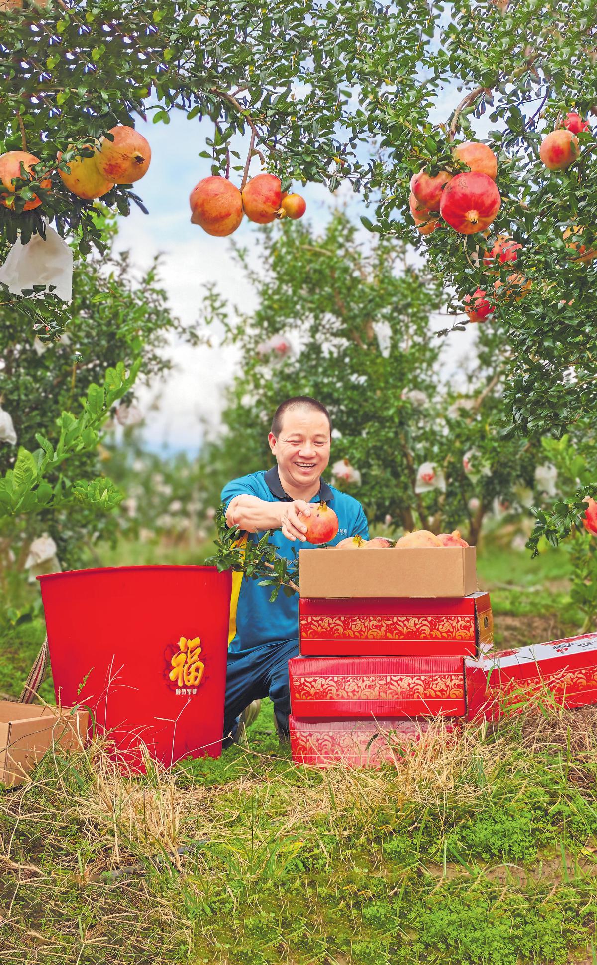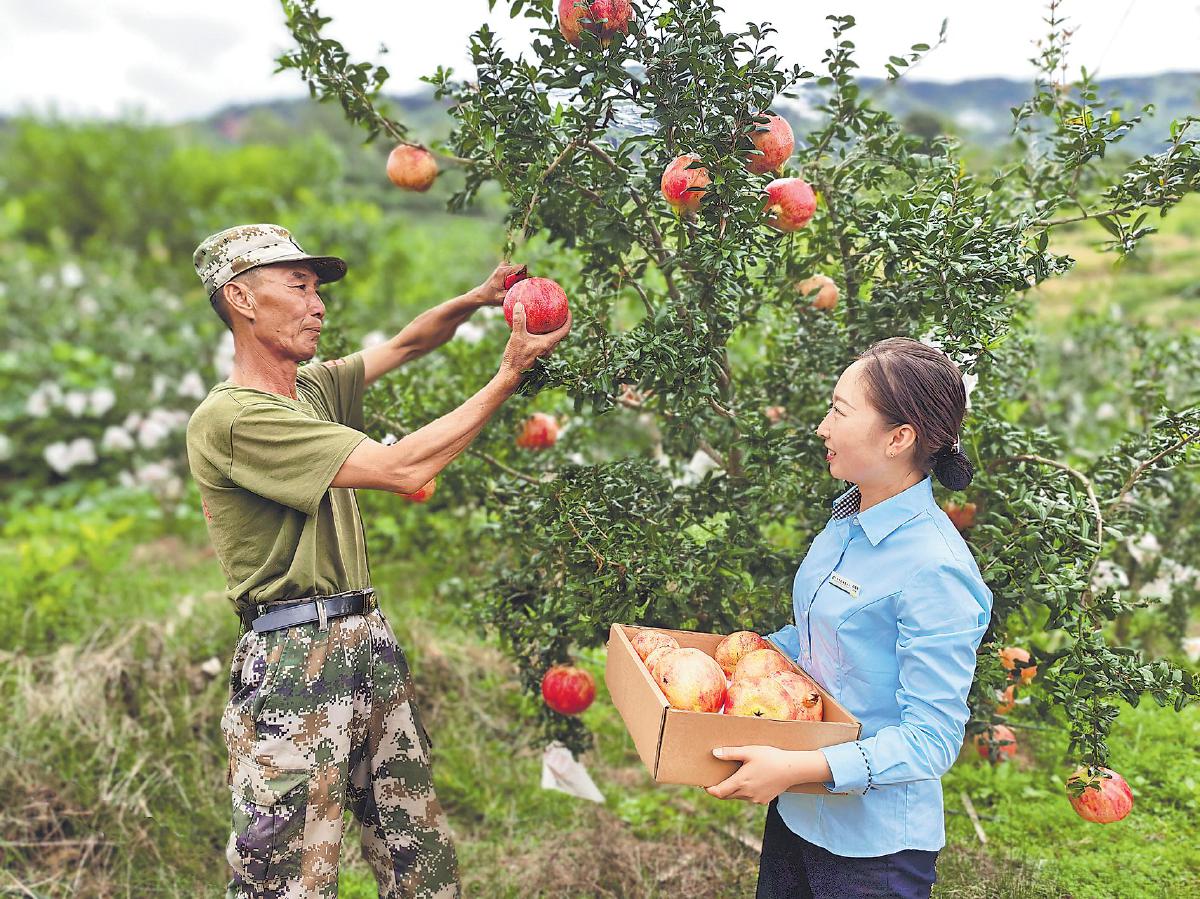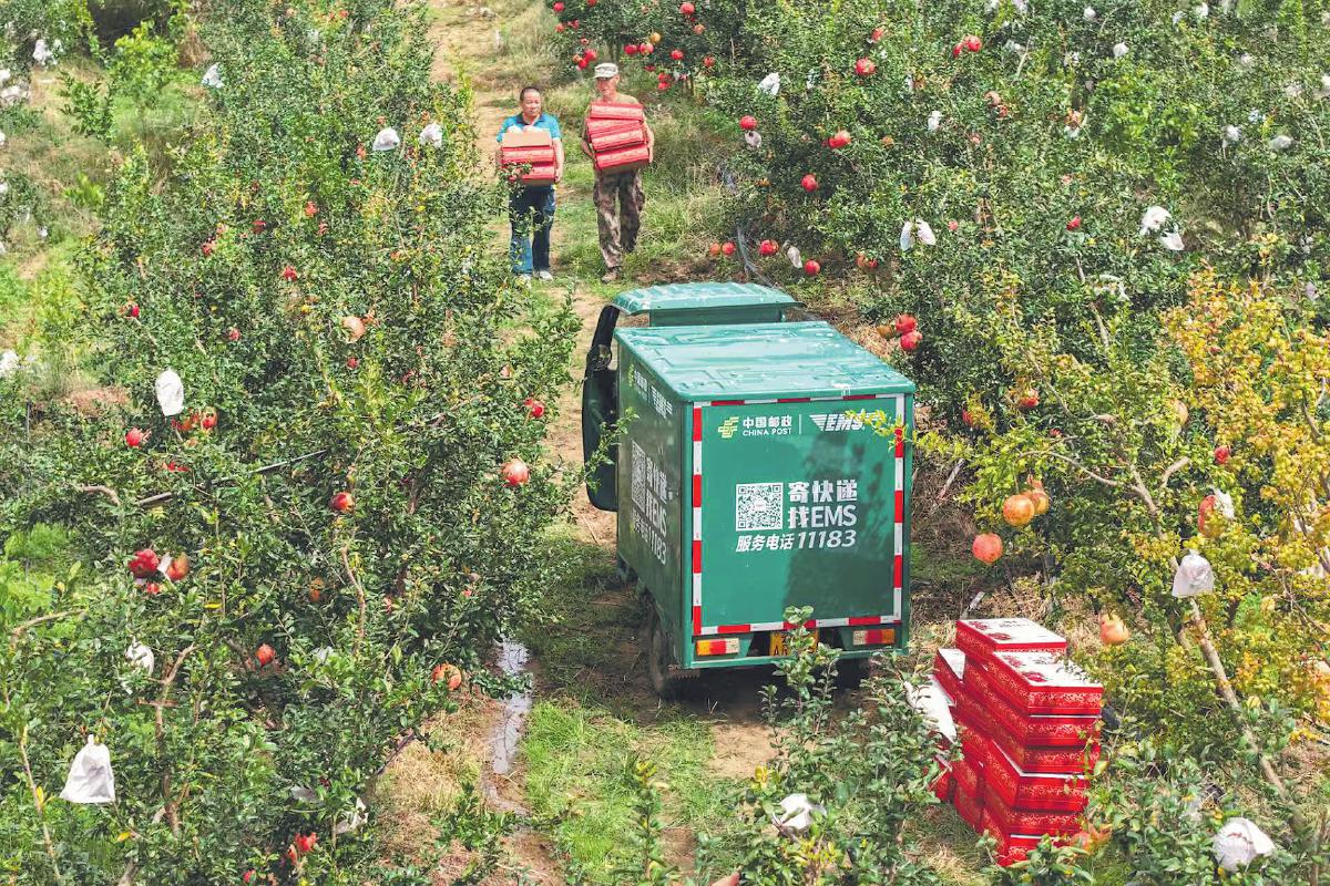 采摘下来的石榴经人工分拣、剔除瑕疵后装入邮政标准箱。