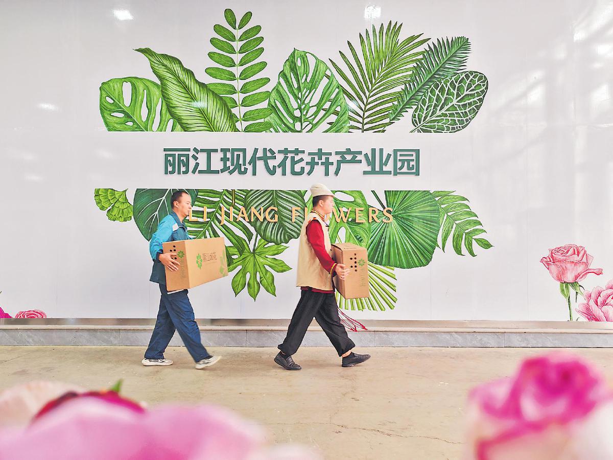 邮政小哥把一箱箱鲜花邮件搬上邮车,让花香随邮车驶向机场,奔向全国消费者。